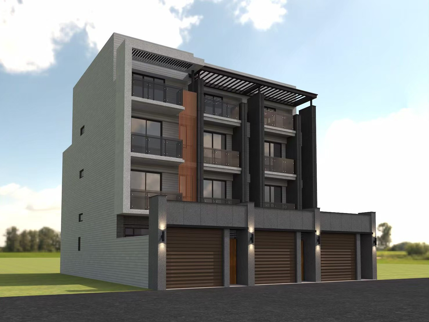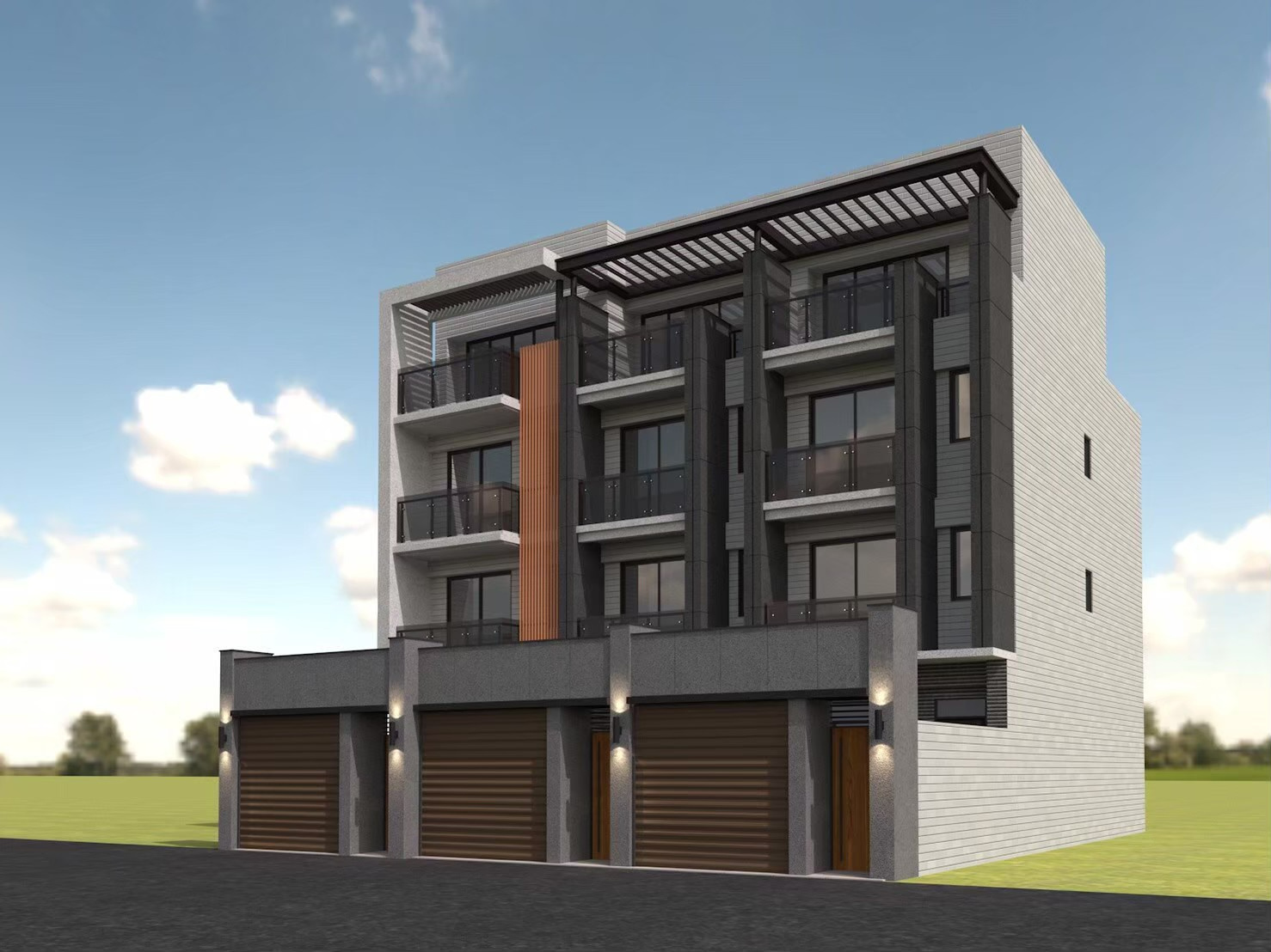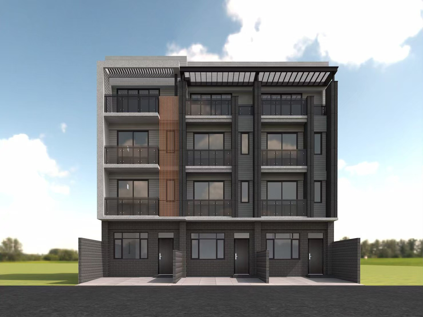 本案為三戶連棟透天住宅,外觀以格柵與二丁掛磚搭配塗料輪廓勾勒,展現簡約而富層次的線條美感。建築兼具質感與實用性,深受自住型客戶喜愛,是現代透天住宅的實踐範例。